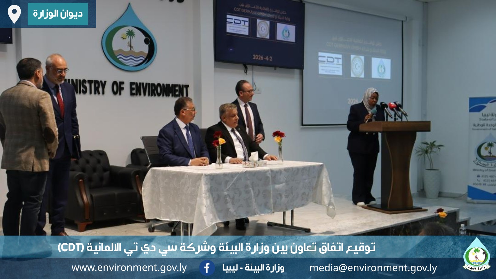وقّعت وزارة البيئة اتفاق تعاون مشترك مع شركة سي دي تي الالمانية (CDT)، وذلك بمقر ديوان الوزارة في طرابلس، في خطوة تعزّز الشراكة بين القطاعين العام والخاص، وتدعم جهود حماية البيئة البحرية والبرية وصون الموارد الطبيعية ، حيث وقّع الاتفاق عن وزارة البيئة وكيل الوزارة الدكتور (إحنين المعاوي إحنين،) فيما وقّع عن شركة سي دي تي الالمانية (CDT) مديرها العام السيد (سعدون عيسى أغلو)، وذلك بحضور عضو مجلس إدارة صندوق حماية البيئة الدكتور (إبراهيم دخيل)، إلى جانب عدد من مديري الإدارات والمكاتب وموظفي ديوان الوزارة..