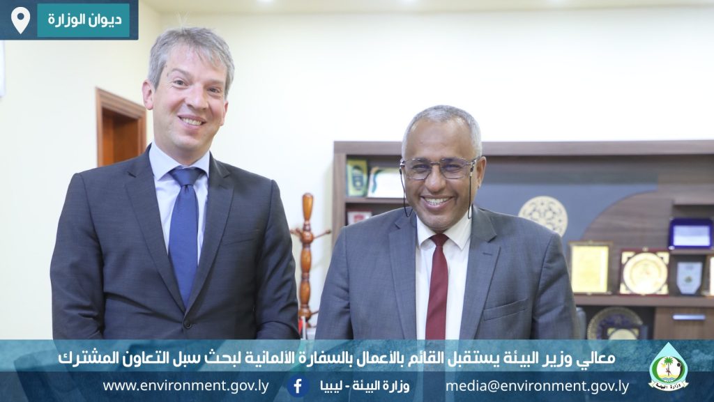 وأعرب معالي الوزير في ختام اللقاء عن امتنانه للجهود التي تبذلها الحكومة الألمانية، من خلال وكالة التعاون الألمانية (GIZ)، في دعم برامج التكيف مع التغيرات المناخية في ليبيا، مؤكداً حرص وزارة البيئة على توسيع مجالات التعاون البيئي والتقني بين الجانبين.