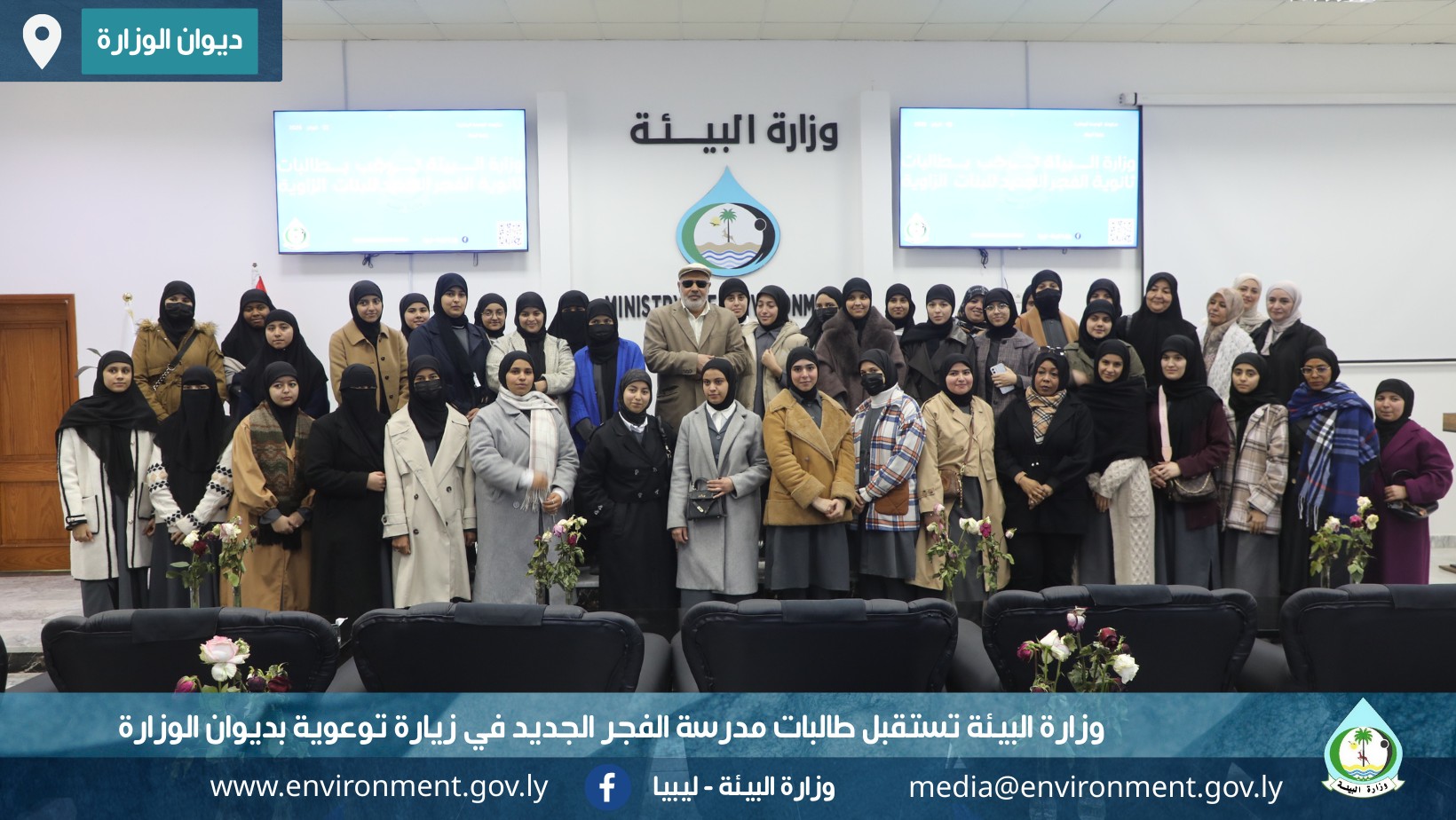 في إطار نشر الوعي البيئي بين فئات المجتمع، إستقبل ديوان وزارة البيئة زيارة طالبات مدرسة الفجر الجديد الثانوية بمنطقة الزاوية ،وقد استُهلت الزيارة بإستقبال الطالبات في قاعة الإجتماعات الرئيسية، حيث قُدمت لهن مجموعة من المحاضرات التوعوية في مجال البيئة، استهدفت 60 طالبة تم تقسيمهن إلى مجموعات عمل، بما يعزز الفهم العملي والتفاعلي للمجالات البيئية المختلفة.