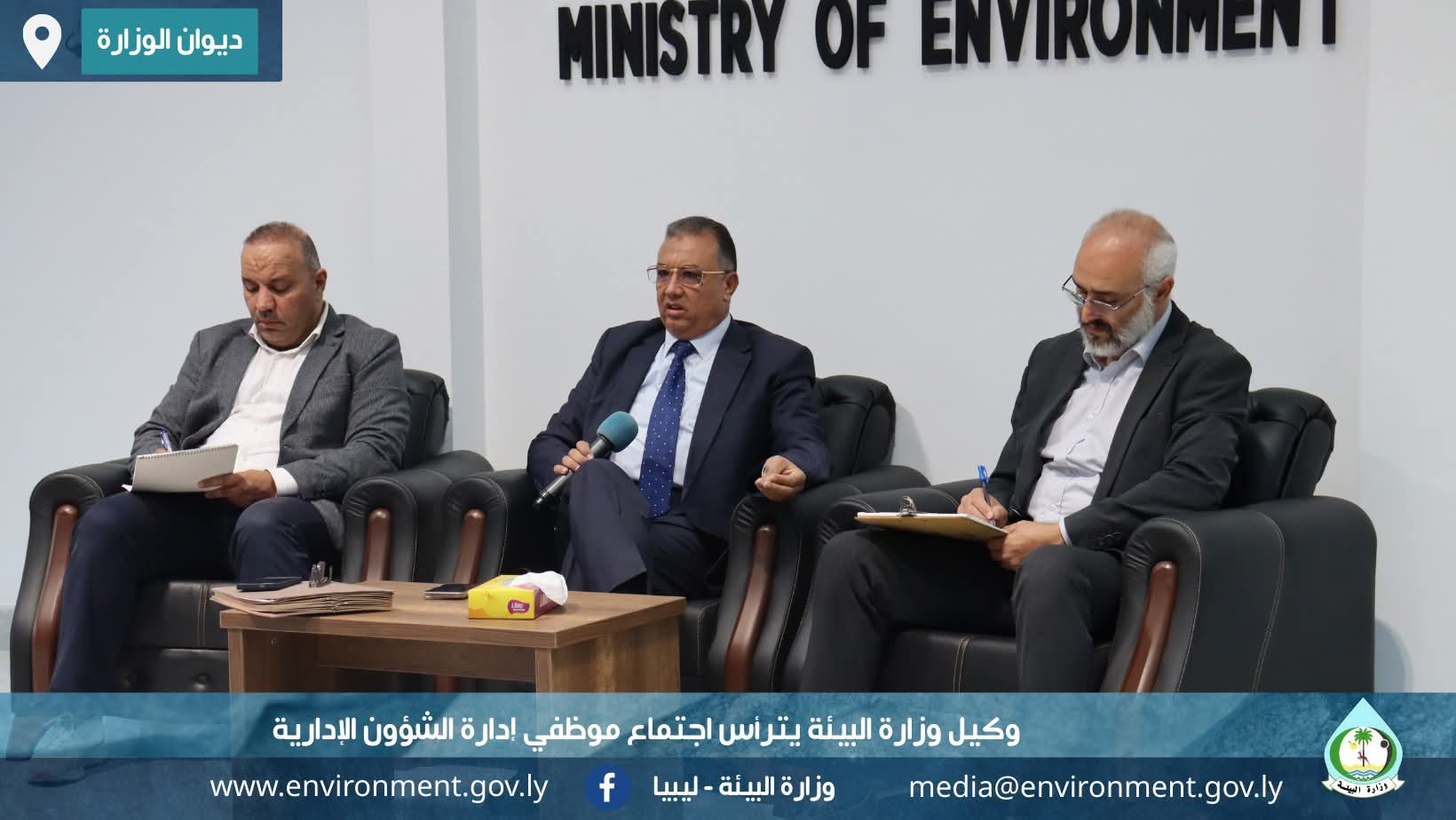 ترأس وكيل وزارة البيئة الدكتور ( أحنين المعاوي أحنين ) اجتماعاً موسعاً لمظفي إدارة الشؤون الإدارية ، بحضور مدير إدارة الشؤون الإدارية ، ومدير مكتب شؤون الوكيل ، إلى جانب رؤساء الأقسام .