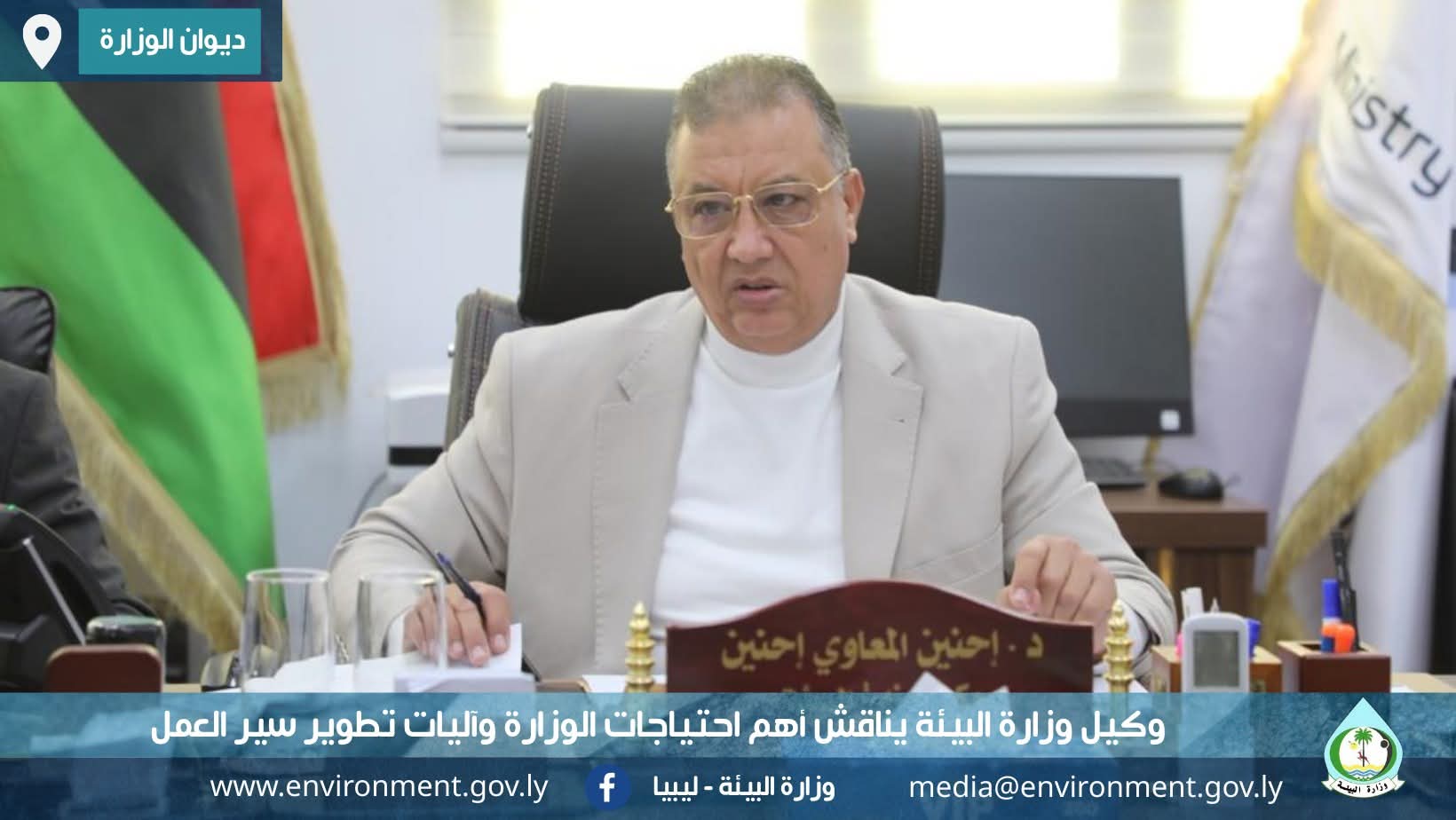 ترأس السيد وكيل وزارة البيئة الدكتور ( إحنين المعاوي إحنين ) ، اجتماعاً موسعاً خصص لمناقشة أهم احتياجات الوزارة ، إضافة إلى بحث المتطلبات الأساسية التي من شأنها تحسين سير العمل ورفع مستوى الأداء داخل الوزارة ، حيث حضر الإجتماع عدداً من مديري الإدارات والمكاتب بديوان الوزارة .
